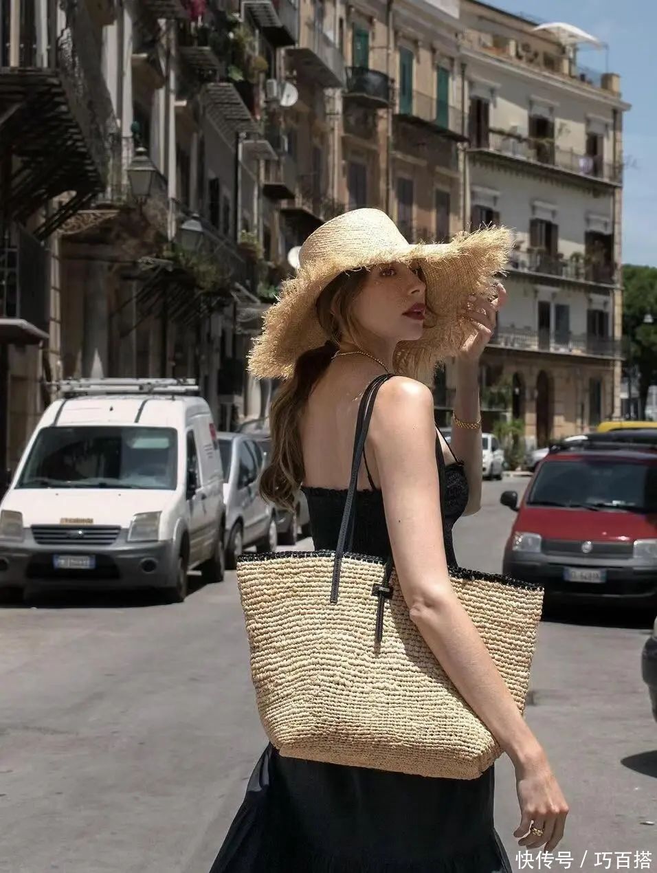 如果大家喜欢戴帽子,像博主一样选择草编帽也是OK的,宽帽檐的遮阳帽可以利用毛边材质增加设计感,有氛围又有辨识度。